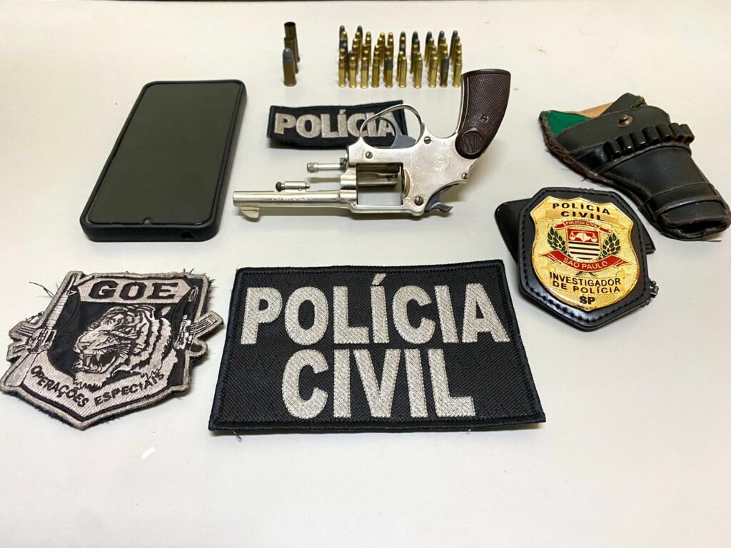 Ação da DDM com apoio do GOE localizou revólver escondido em quarto e munições no veículo do investigado Na tarde desta sexta-feira (23), equi...