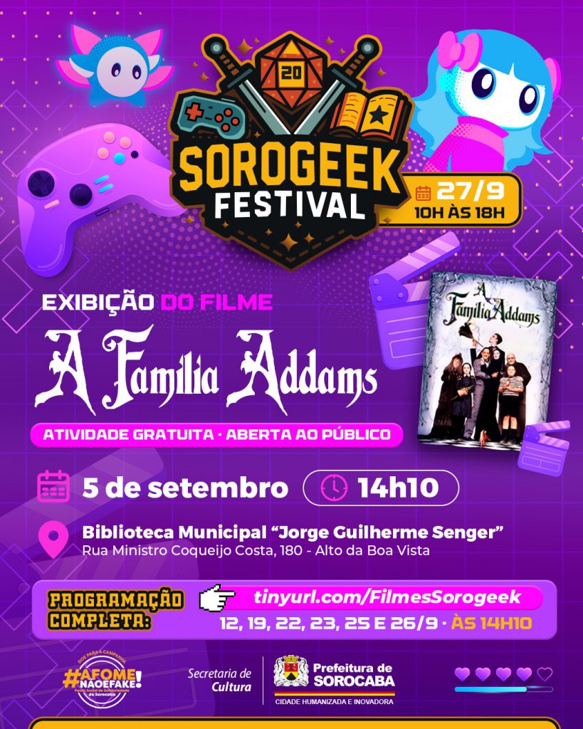 A população contará com uma programação especial de filmes preparada para a 1ª edição do “SoroGeek Festival”. As exibições gratuitas têm início na próxima sexta-feira (5), às 14h10, no auditório da Biblioteca Municipal “Jorge Guilherme Senger”, com o filme “A Família Addams” (1991), com direção de Barry Sonnenfeld.