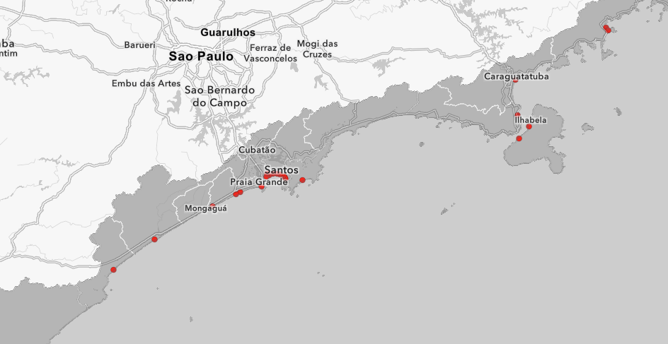 A Baixada Santista concentra o maior número de praias com bandeira vermelha. Santos possui seis praias impróprias, enquanto São Vicente tem quatro, e a região da Praia Grande também registra quatro pontos com restrição. No litoral norte, a Praia de Itaguá, em Ubatuba, aparece duas vezes na lista devido à sua extensão. Outras praias do litoral norte com restrições incluem Indaiá (Caraguatatuba), São Francisco (São Sebastião), Itaquanduba e Portinho (Ilhabela).
