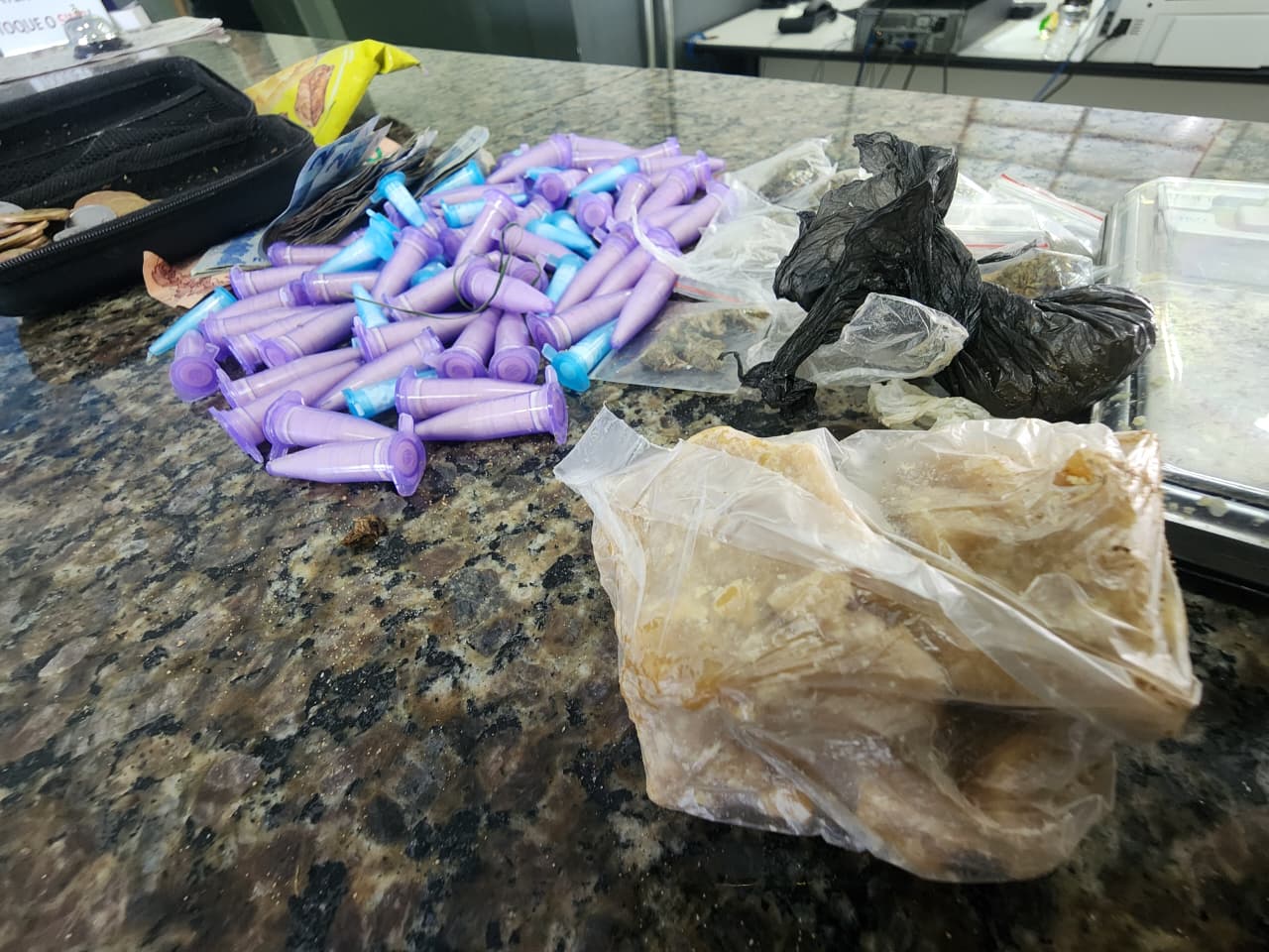 No outro bolso, foram encontrados 71 pinos de cocaína, uma porção de maconha pronta para venda e três pedras brutas de crack, totalizando 78,64 gramas da droga. Ao lado do adolescente também estavam uma balança de precisão, uma tesoura e uma lâmina de estilete, utilizada para fracionar o entorpecente.