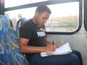 “No transporte, como eu pegava quatro ônibus e passava bastante tempo do dia neles, eu fazia questões”, lembra o jovem, que usava livros e celular para a resolução dos exercícios durante as viagens. Ele conta que Valdemir sempre dirigia de forma calma, e conseguia aproveitar para estudar.