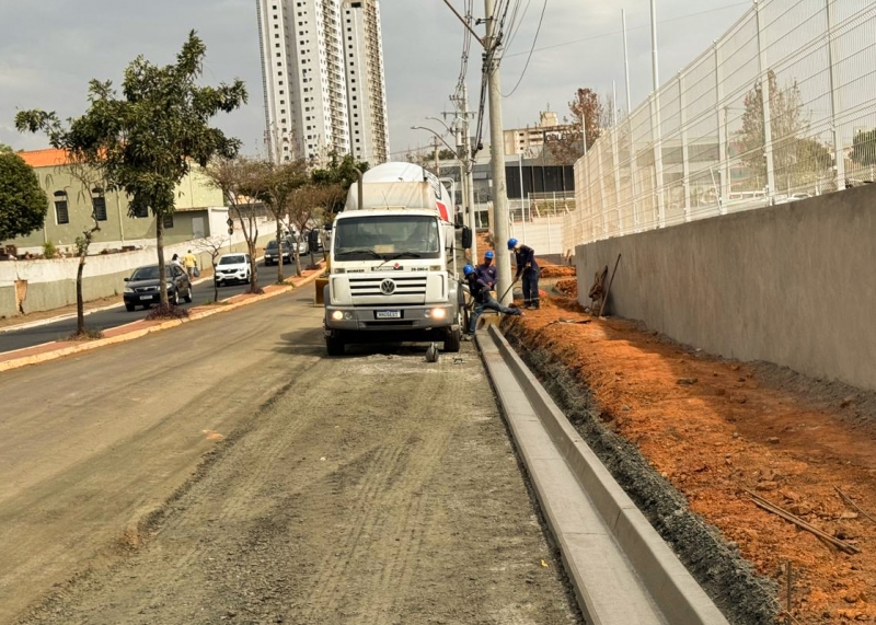 As obras de alargamento da pista no sentido Centro da Avenida Bandeirantes seguem em ritmo avançado. As equipes atuam na configuração da nova faixa de rolamento, com a concretagem de guias e sarjetas, compactação e aplicação de brita para posterior asfaltamento, com o objetivo de melhorar a fluidez e a organização do tráfego de veículos.