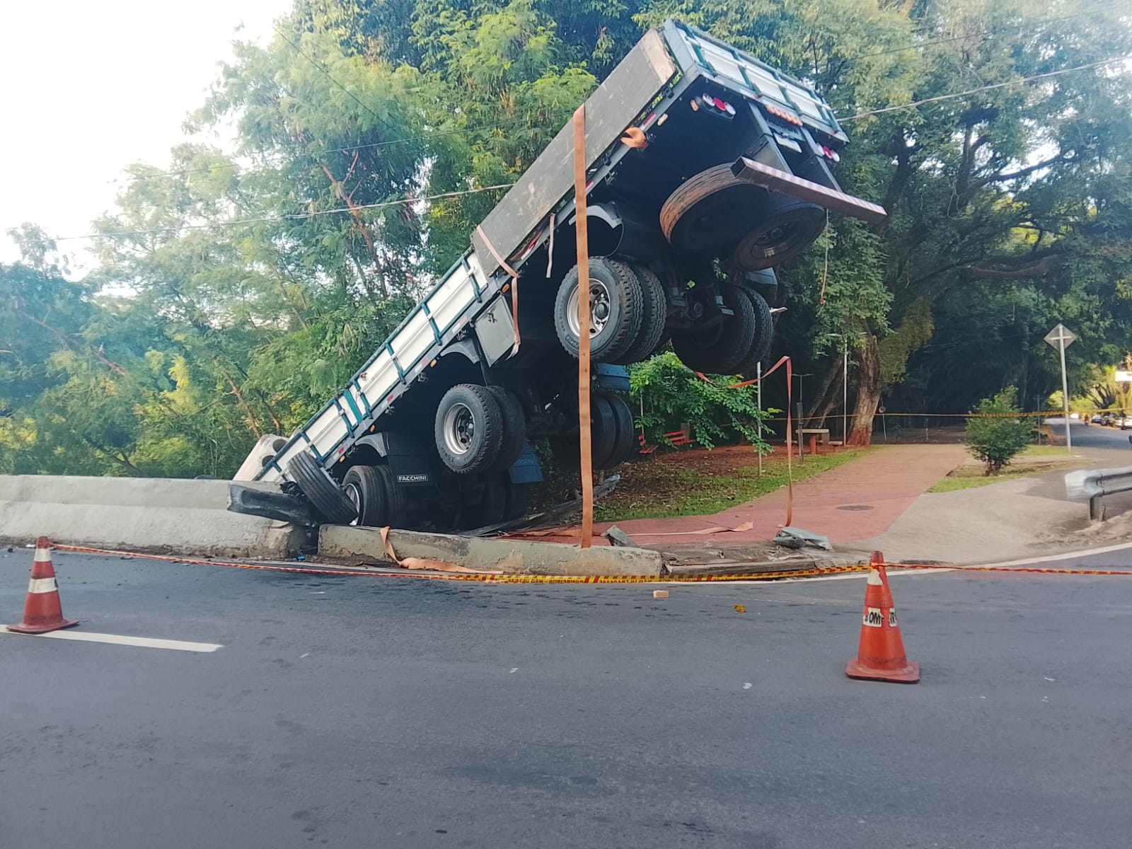 Um caminhão carregado com postes de energia elétrica caiu às margens do Rio Piracicaba na manhã desta segunda-feira (12), após o motorista perder o controle do veículo na Avenida Presidente Kennedy, na região central de Piracicaba (SP). Com o impacto, a traseira do caminhão ficou inclinada em direção ao rio, e parte da carga se espalhou pelo local.