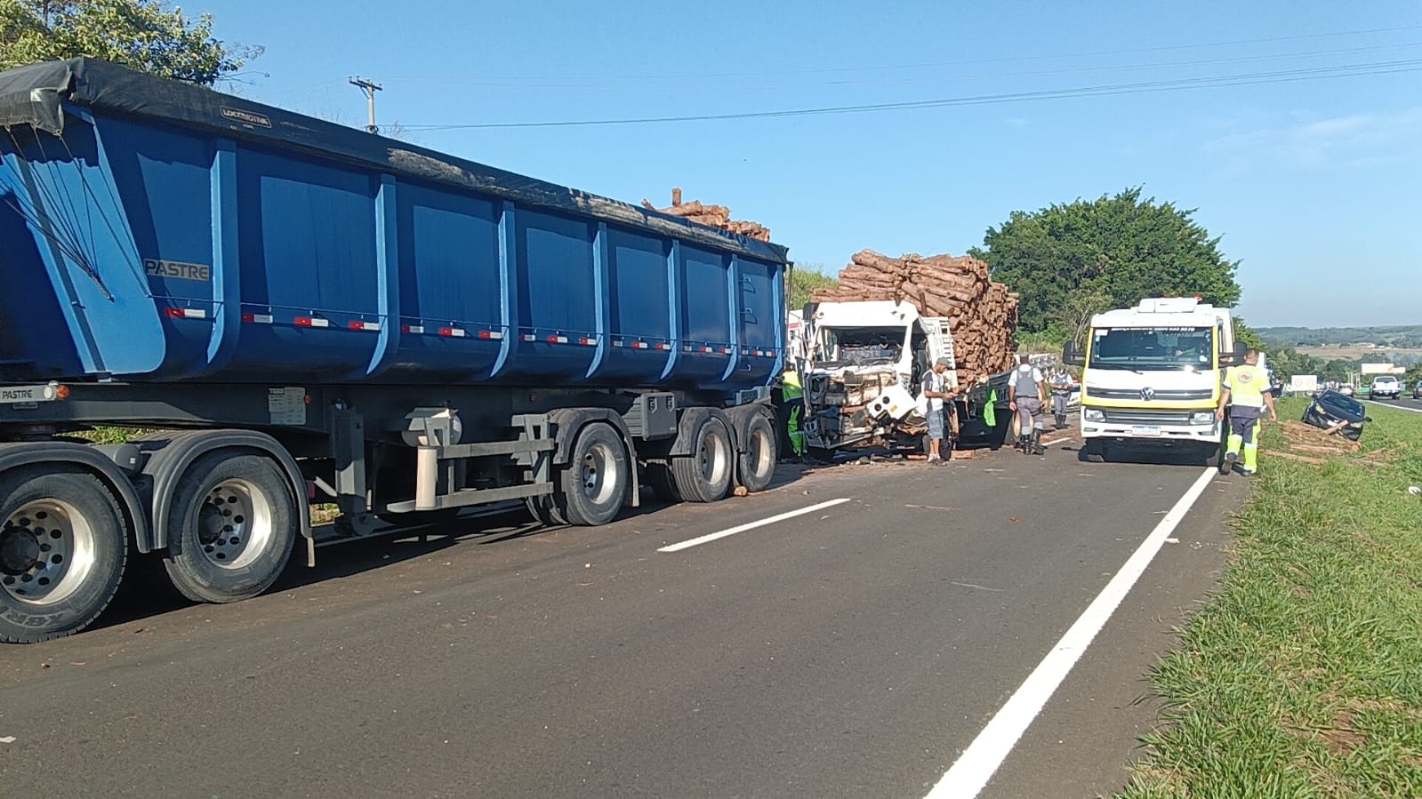 O Departamento de Estradas de Rodagem (DER) trabalha na remoção da carga e na limpeza da via. O trânsito segue lento no trecho devido à presença das equipes e à madeira espalhada pela pista.