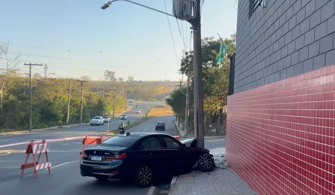 De acordo com informações, uma BMW 320i preta foi abandonada no local e os agentes precisaram isolar a área, já que o veículo acabou colidindo violentamente contra um poste de iluminação pública. Devido ao choque da colisão, o transformador está sendo sustentado apenas por um cabo de energia, e o poste apresenta risco de queda.