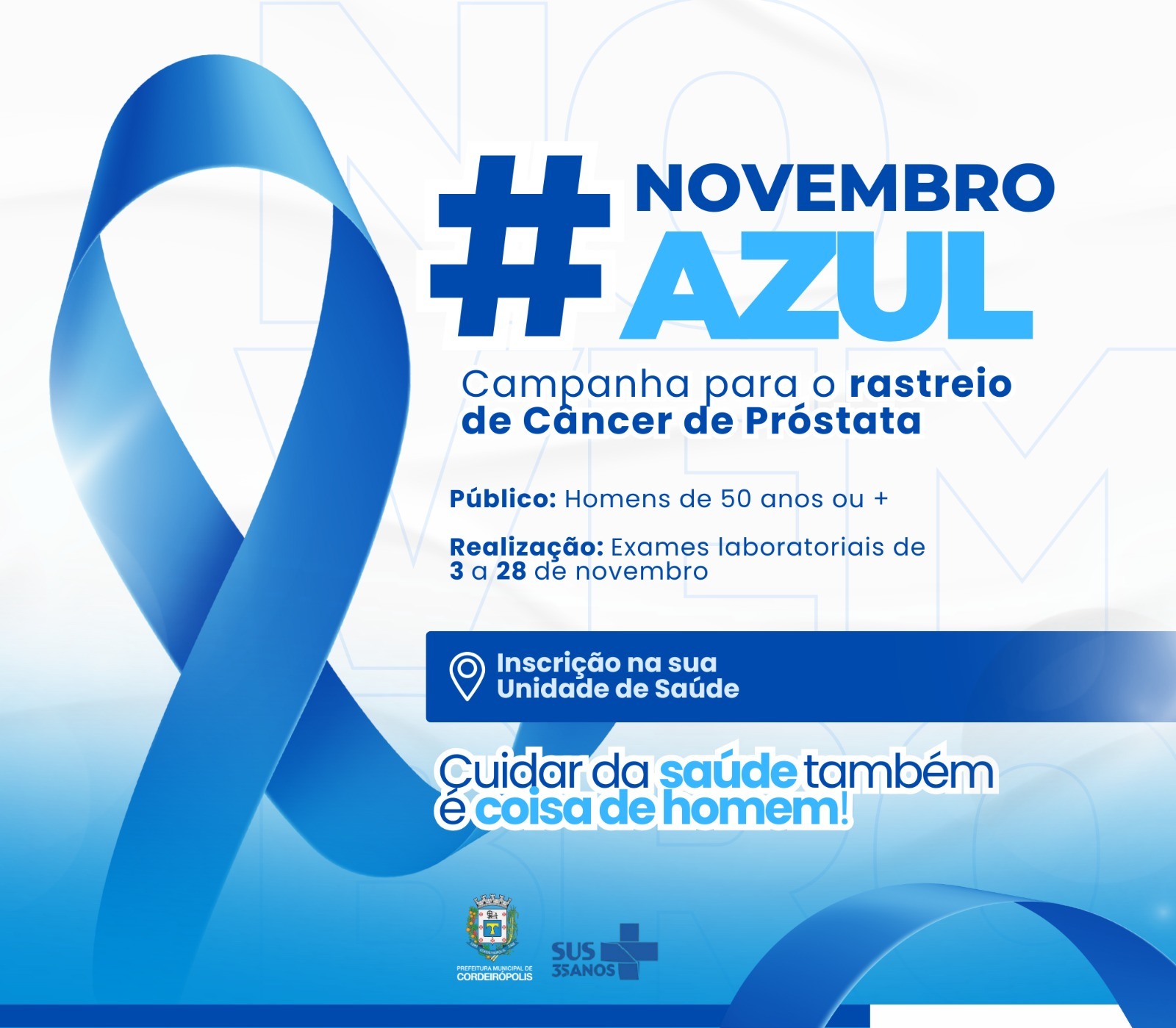 A Prefeitura de Cordeirópolis, por meio da Secretaria de Saúde, inicia na segunda-feira (3) a campanha Novembro Azul, dedicada ao rastreio e à prevenção do câncer de próstata, uma das doenças que mais afetam a saúde masculina no Brasil.