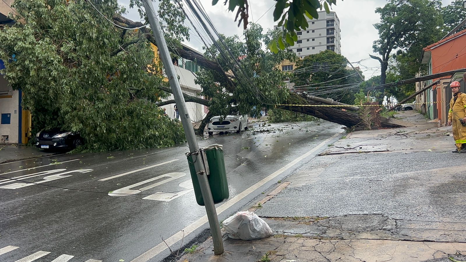 Veículo estava estacionado e outro automóvel também foi atingido, derrubando poste; cidade registrou múltiplas ocorrências provocadas pela chuva e ventos fortes