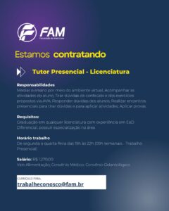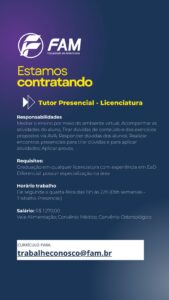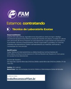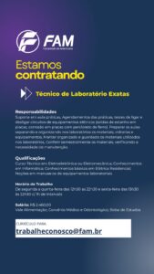 A FAM (Faculdade de Americana) está com vagas abertas em duas áreas diferentes: duas para Técnico de Laboratório Exatas e duas vagas para Tutor Presencial – Licenciatura.