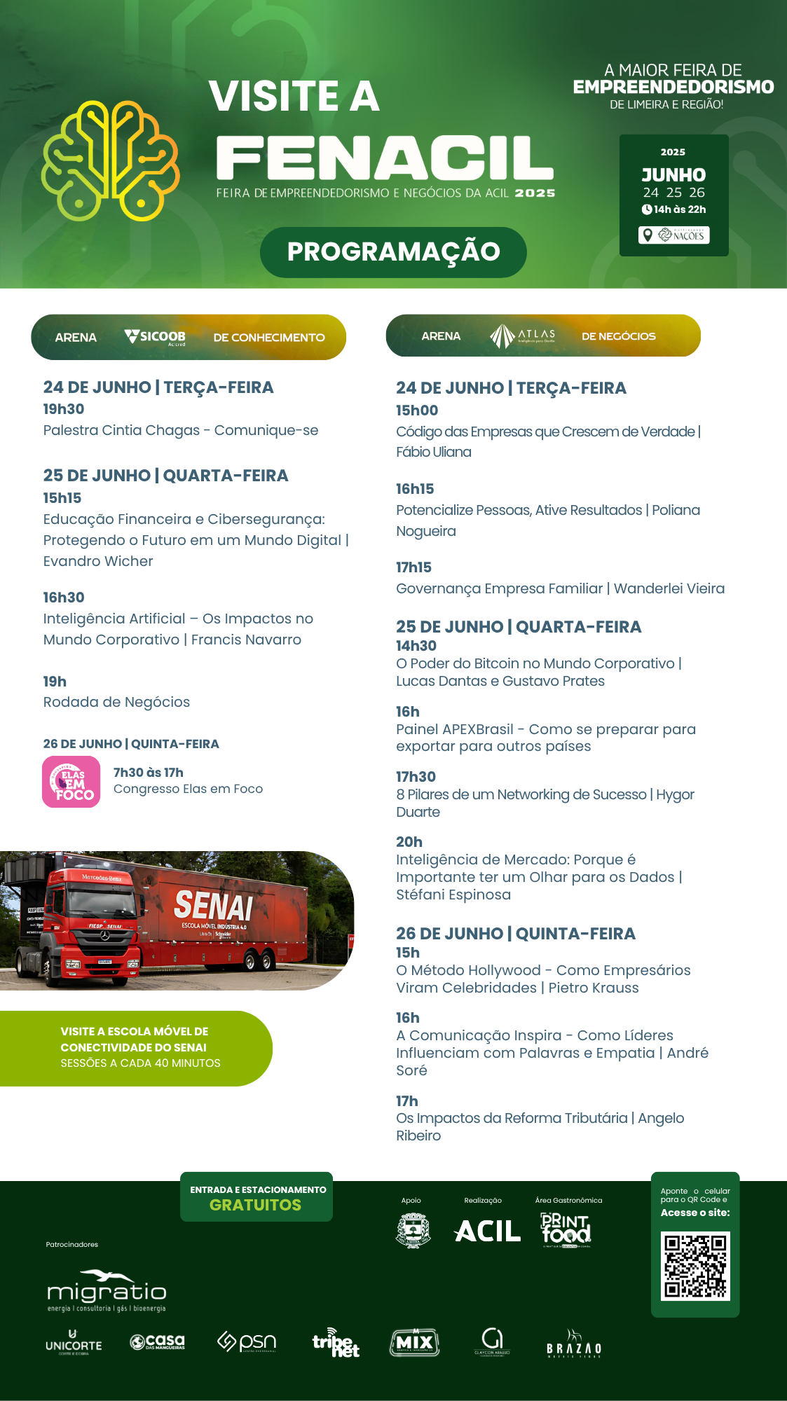 Além da área de exposição, o evento contará com duas arenas de conteúdo que receberão palestrantes renomados e painéis com temas de grande relevância para empresários, profissionais e empreendedores: a Arena do Conhecimento Sicoob e a Arena de Negócios Atlas. Para completar a experiência do visitante, a FENACIL 2025 também terá a Arena Gastronômica Print Food, com diversas opções de alimentação, reunindo sabores para todos os gostos e paladares, ideal para quem deseja aproveitar o evento com conforto e qualidade.