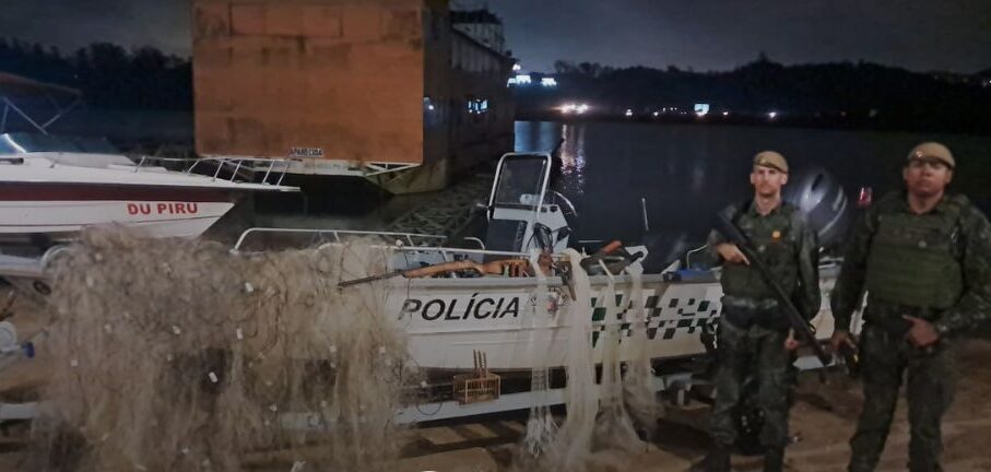 Na área, os policiais encontraram um pequeno rancho improvisado e diversos apetrechos utilizados para pesca predatória. Entre os itens apreendidos estavam quatro tarrafas com malha de 0,10 mm, duas redes de pesca com 200 metros de comprimento cada, um estilingue, dois facões e um alçapão para captura de aves.