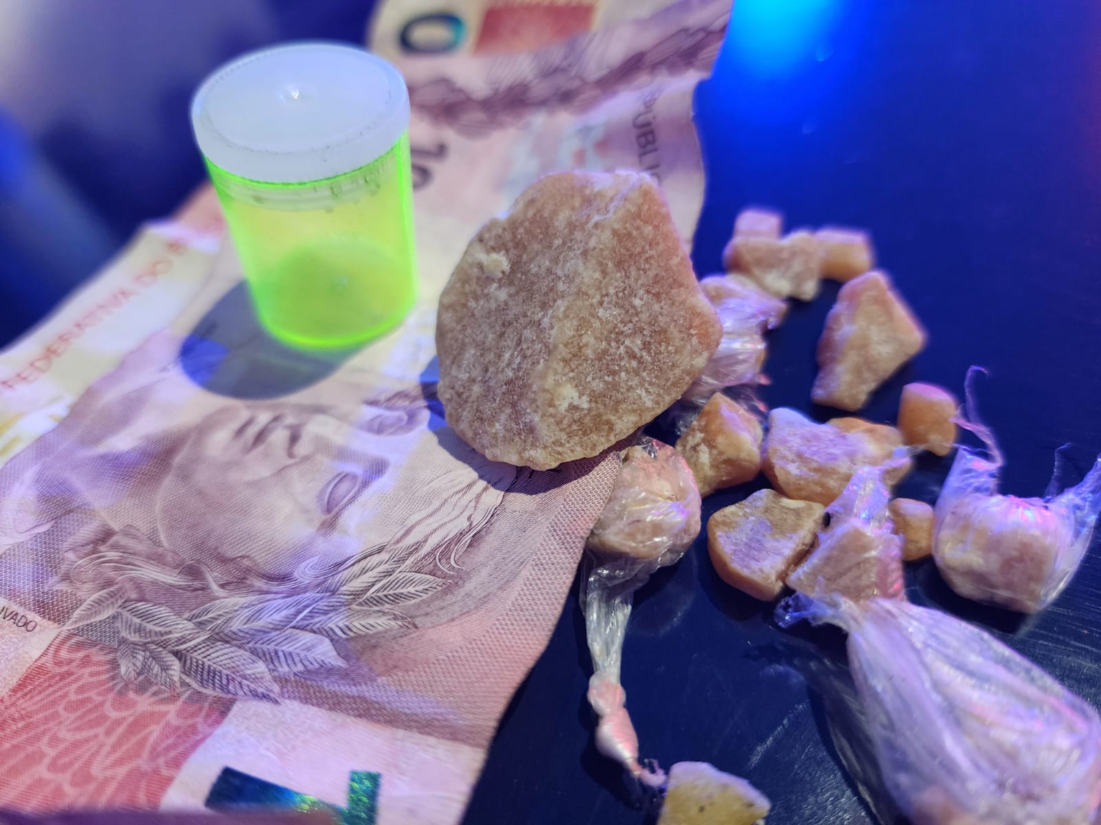 Com a suspeita, os agentes encontraram R$ 30 e duas pedras de crack. Ao refazer o trajeto da fuga, os guardas localizaram mais 15 pedras pequenas e uma “rocha” maior da droga em estado bruto, confirmando o tráfico.