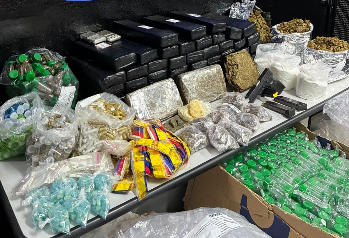 Durante a averiguação, foram localizadas substâncias aparentando ser maconha, cocaína, crack, haxixe e metanfetamina, além de material utilizado para preparo e fracionamento de drogas.