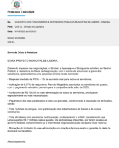 – Conceder pagameto dos dias paralisados a todos grevistas, com 3 atividades de reposição, sendo: 3 mutirões da dengue com trabalhadores da saúde e outras secretarias; 3 atividades com servidores da Educação contemplando o VAAR, visto que Limeira perde 7 milhões neste quesito. Os sindicalistas presentes por ter acesso ao governo federal nos comprometemos a abrir portas para recuperar este recurso.