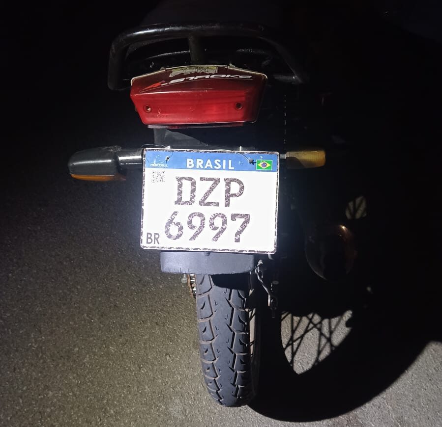 Os guardas realizaram breve acompanhamento e deram ordem de parada ao condutor. Na vistoria, constataram que o chassi da motocicleta, uma Yamaha YBR 125K vermelha, estava suprimido. Além disso, a placa de formato Mercosul apresentava irregularidades, exibindo quatro números, o que não é permitido.