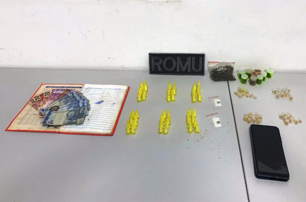Na sacola plástica havia 60 porções de cocaína, 39 de crack, 12 de maconha e R$ 58 em dinheiro, além de um caderno contendo anotações de possíveis vendas de drogas.