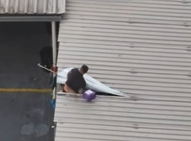 As imagens mostram o suspeito saindo com dificuldade pelo telhado do estabelecimento, quase perdendo a bermuda, enquanto carregava um pote roxo grande, que aparentava ser de açaí. Após caminhar sobre o telhado, ele saltou para o pátio da frente da loja e, em seguida, usou uma mesa como apoio para retornar à parte interna do comércio.
