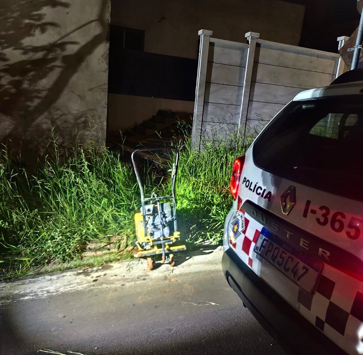 Questionado sobre os fatos, o homem confessou que possuía uma dívida de grande valor e que, com o auxílio de outros três indivíduos, pretendia subtrair máquinas do interior da obra. Durante a vistoria na área externa, os policiais localizaram uma placa compactadora vibratória a gasolina, avaliada em aproximadamente R$ 6 mil, já posicionada na calçada. Também foi constatado um tapume derrubado, com uma abertura que dava acesso ao interior do canteiro de obras.