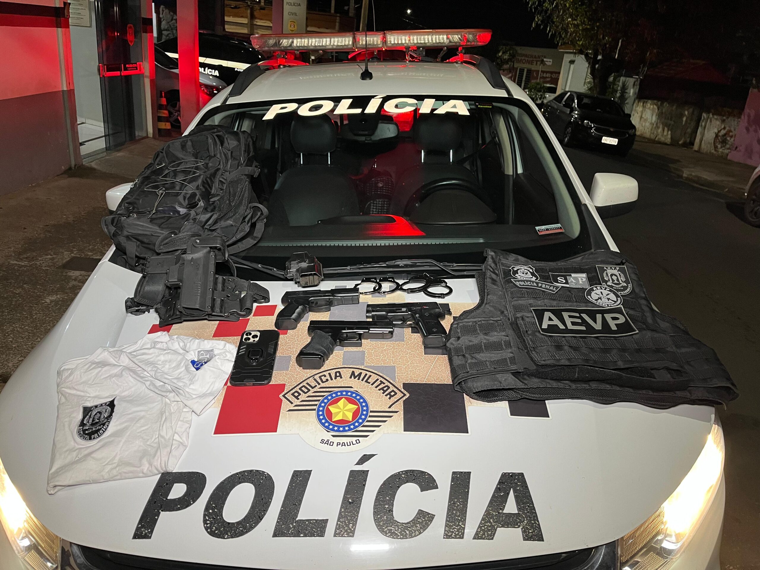 No interior do carro, foram encontrados três simulacros de arma de fogo, um colete que imitava ser à prova de balas, algemas e coldres, todos com identificação que sugeria se tratar de materiais de uso da SAP (Secretaria de Administração Penitenciária).