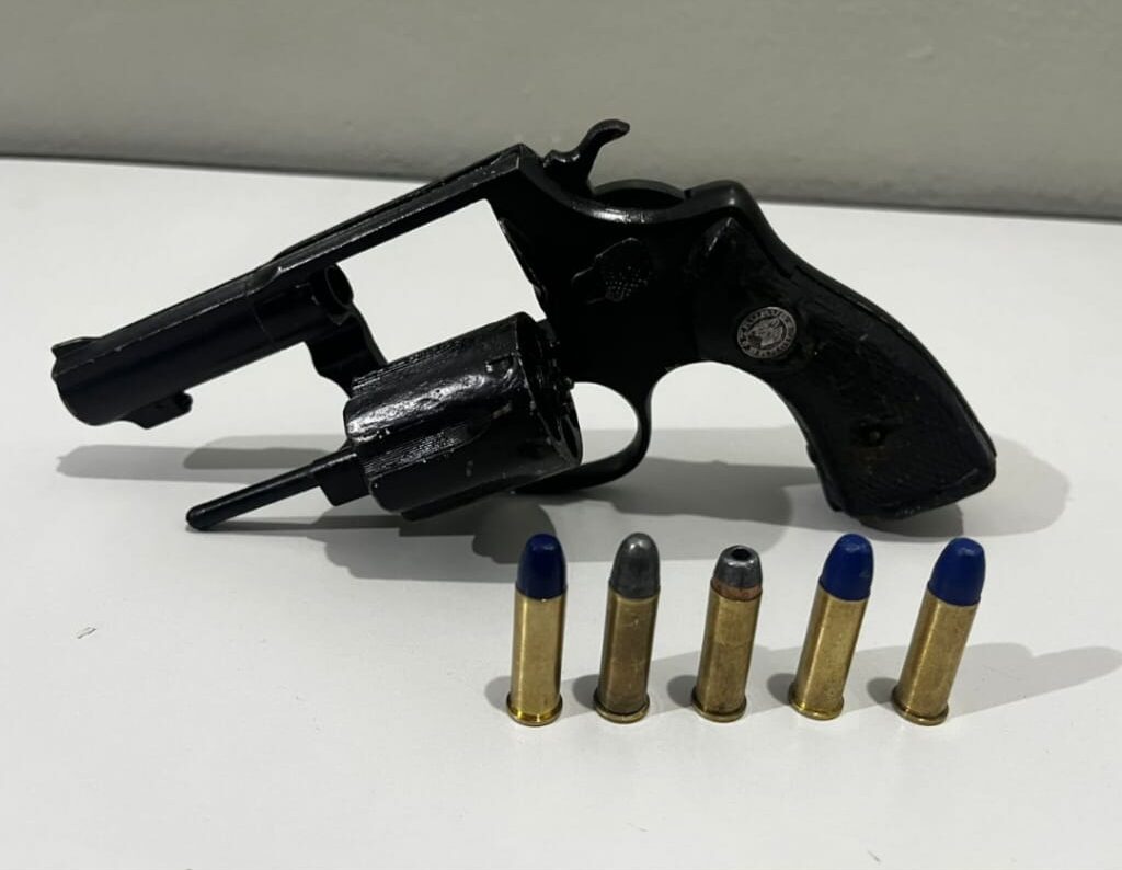 No imóvel, os policiais encontraram um revólver calibre .38, com numeração suprimida, cano de 3 polegadas, cor preta, cabo de madeira, e municiado com cinco munições intactas.