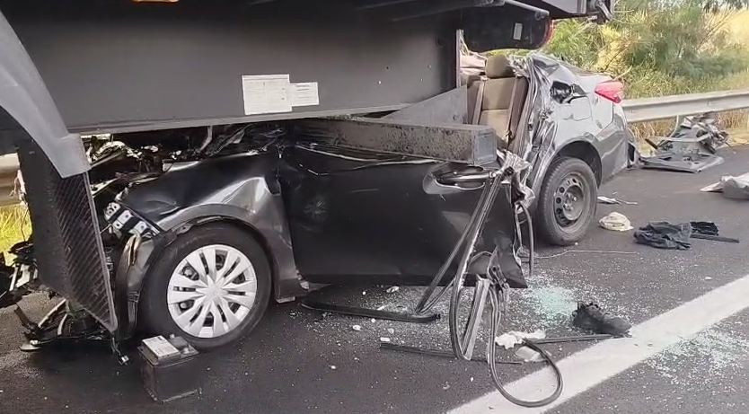 O impacto foi tão forte que o carro ficou preso na traseira da carreta. As causas do acidente ainda estão sendo apuradas.