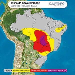 Esse padrão de ar seco também é observado em outras regiões do país, como no Centro-Oeste e em partes de Minas Gerais. Em São Paulo, por exemplo, a umidade pode cair abaixo dos 20% durante a tarde, enquanto que em Belo Horizonte (MG), os índices devem oscilar entre 21% e 30%, o que já configura um estado de atenção. No Triângulo Mineiro, a situação pode ser ainda mais crítica, com URA abaixo de 12%.