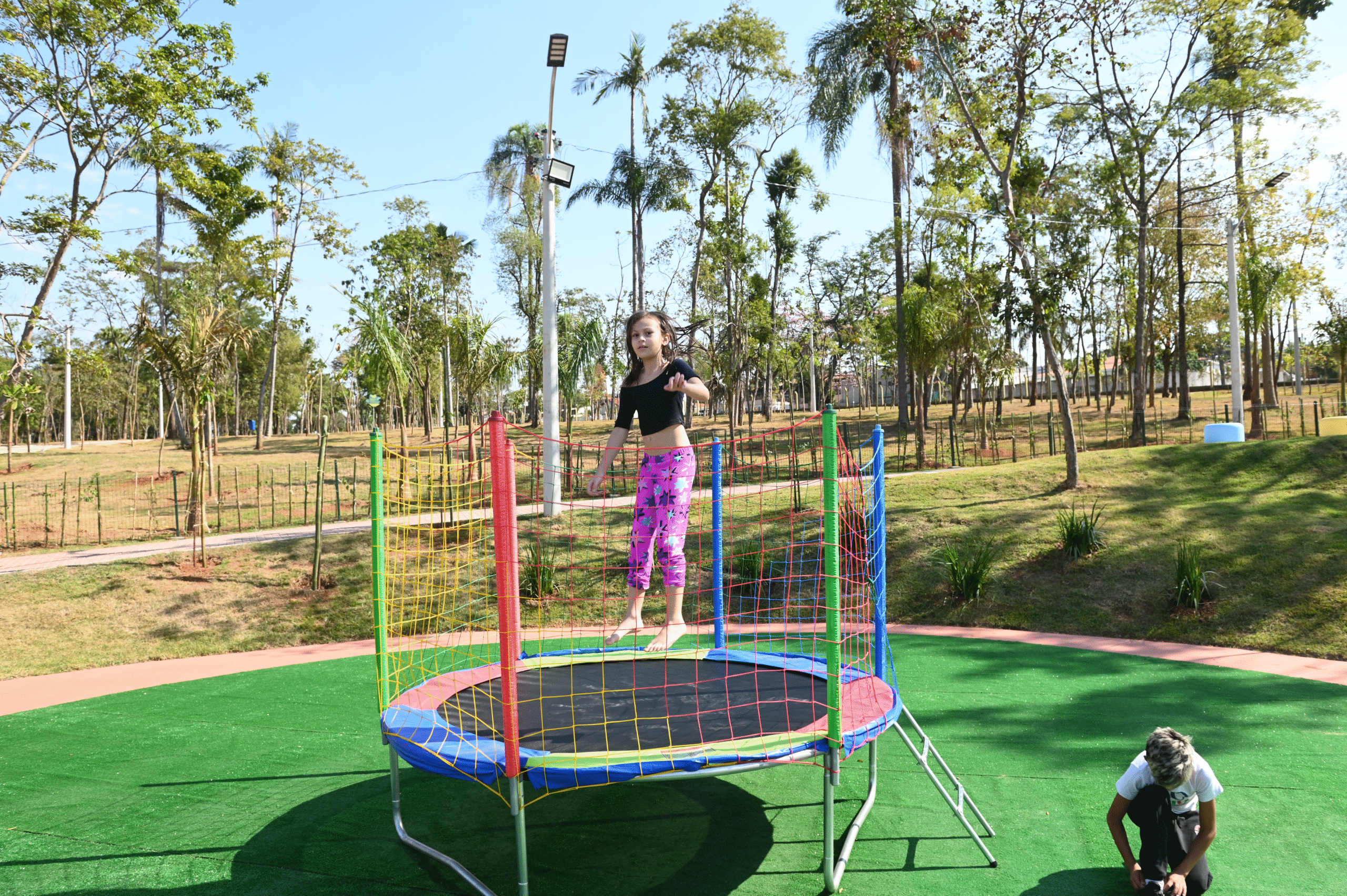 Tem ainda pista de caminhada com piso intertravado, brinquedos para crianças como gangorras, gira-gira, balanços em formatos diferentes dos convencionais, cama elástica; espaço para piquenique; área de descanso; espaço de amamentação; praça molhada, com jatos d´água; piso de diversas texturas; grama sintética; vasos com temperos; bebedouros; mesas e bancos; lixeiras; paisagismo.