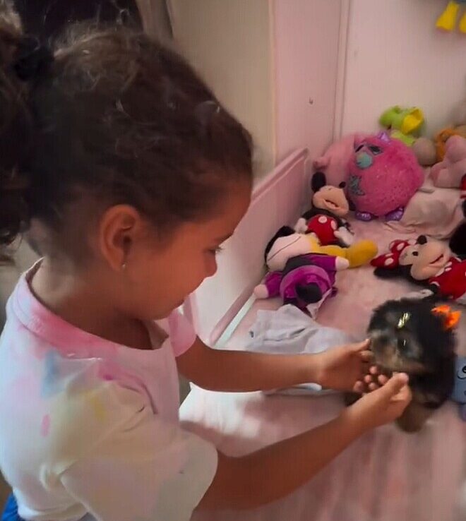 No vídeo é possível ouvir a menina em prantos ao perceber que o filhote estava ali, esperando por ela.