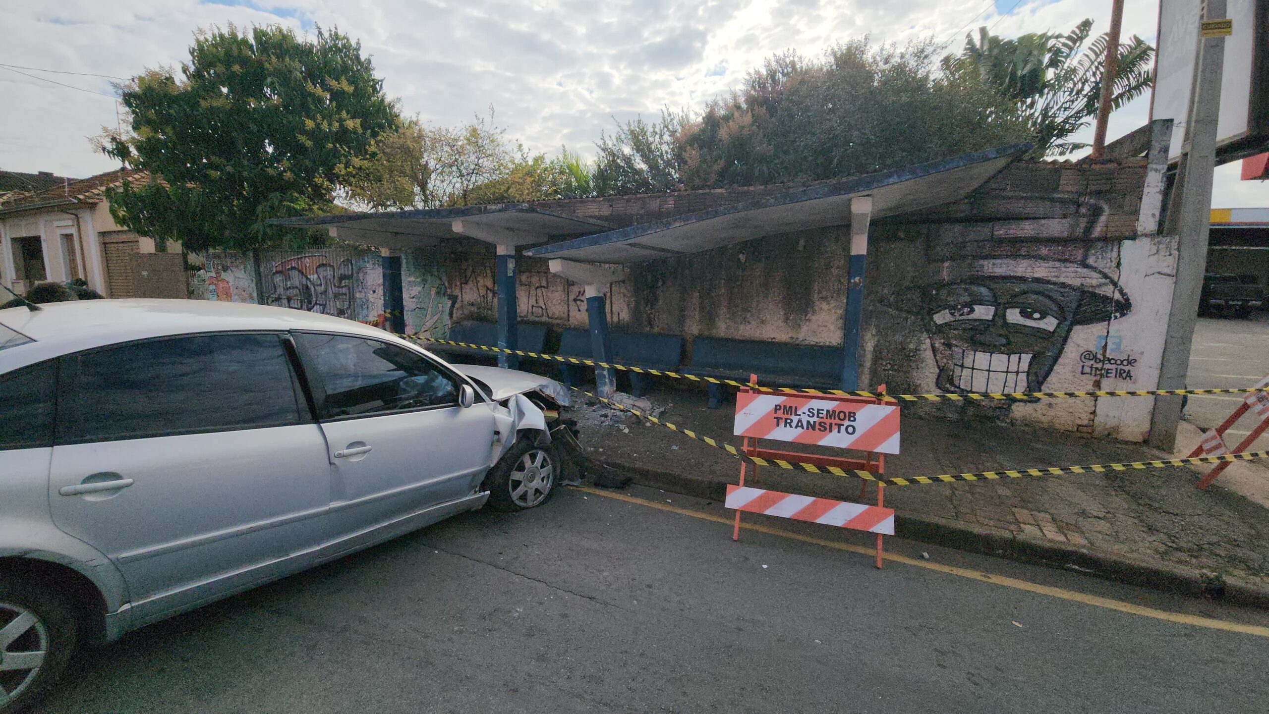 O impacto da batida causou danos significativos tanto no veículo quanto na estrutura do ponto de ônibus, além de abalar o muro localizado na parte de trás da estrutura. Agentes de trânsito interditaram o local para garantir a segurança e organizar o fluxo viário.