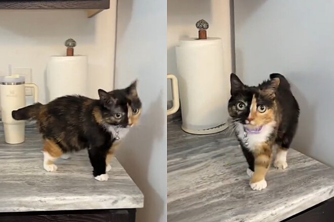 A tutora, Katie Stocks, só descobriu a condição da gatinha semanas após a adoção, quando notou a diferença gritante entre os irmãos.