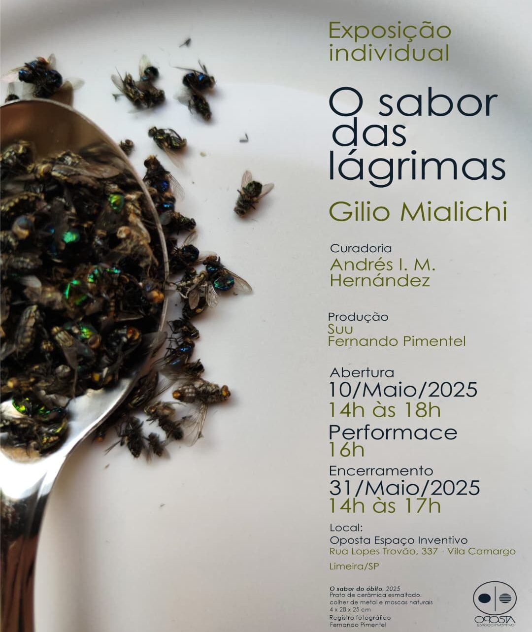 O artista visual Gilio Mialichi apresenta sua nova exposição, “O Sabor das Lágrimas”, na Oposta Espaço Inventivo, em Limeira. A abertura será no dia 10 de maio, das 14h às 18h. Na ocasião, às 16h, o artista fará uma performance inédita ao ar livre, explorando o universo matero pessoal, em confronto ao que define como “atravessamentos dolorosos psicofamiliares”.