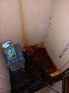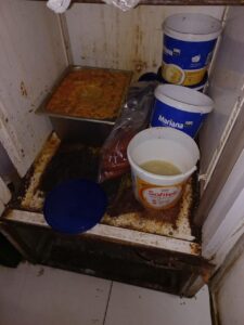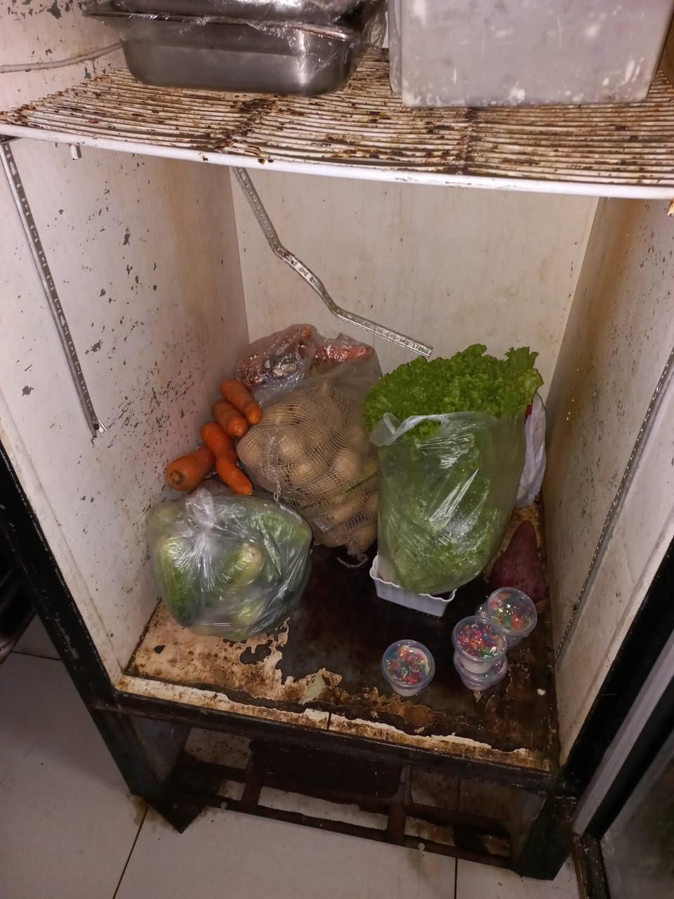 Durante a abordagem da Vigilância, foi constatado que o estabelecimento funcionava sem licença e apresentava condições estruturais precárias, com problemas em paredes, pisos e tetos. Foram identificados ainda equipamentos deteriorados, como geladeiras com ferrugem, utensílios em mau estado de conservação, falta de higiene geral e ausência de boas práticas de manipulação de alimentos.