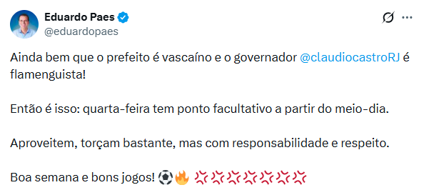 “Ainda bem que o prefeito é vascaíno e o governador Claudio Castro é flamenguista! Então é isso: quarta-feira tem ponto facultativo a partir do meio-dia. Aproveitem, torçam bastante, mas com responsabilidade e respeito. Boa semana e bons jogos!”, primeiro postou Paes.