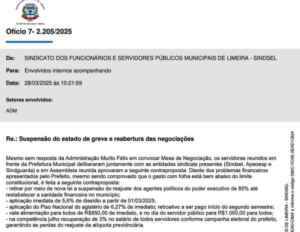 O Sindicato dos Funcionários e Servidores Públicos Municipais de Limeira (SINDSEL) publicou na manhã desta sexta-feira (28) que os servidores reunidos em frente à Prefeitura deliberaram, juntamente com as outras entidades sindicais presentes (Apeoesp e Sindguarda), aprovaram em assembleia e protocolaram uma contraproposta.