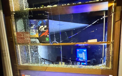 Ao chegarem ao endereço indicado, os guardas constataram que a vitrine de um comércio de telefonia celular havia sido estilhaçada. No local, foram encontradas duas embalagens vazias de celulares sobre a calçada.