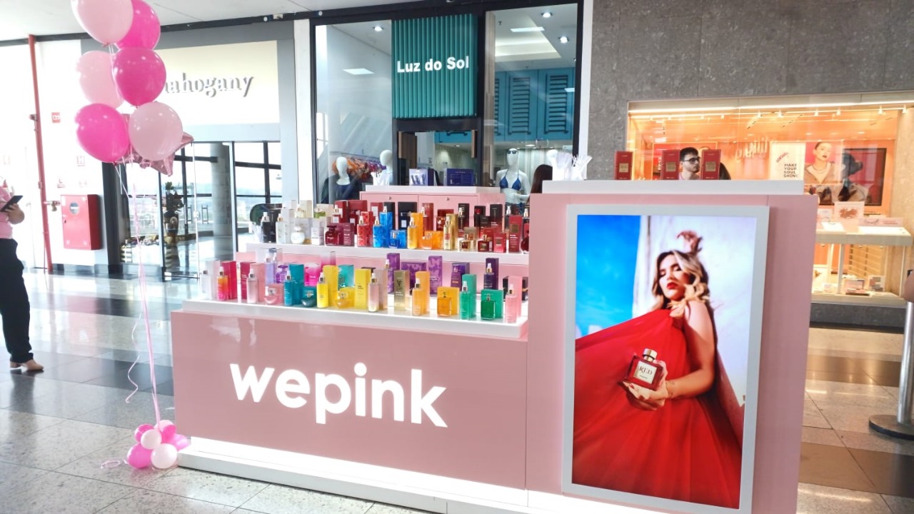 O quiosque da Wepink está localizado no piso térreo, próximo à escada rolante. A operação traz itens tradicionais e os queridinhos da marca, como os body splashs, sérum facial, óleo corporal e perfumes.